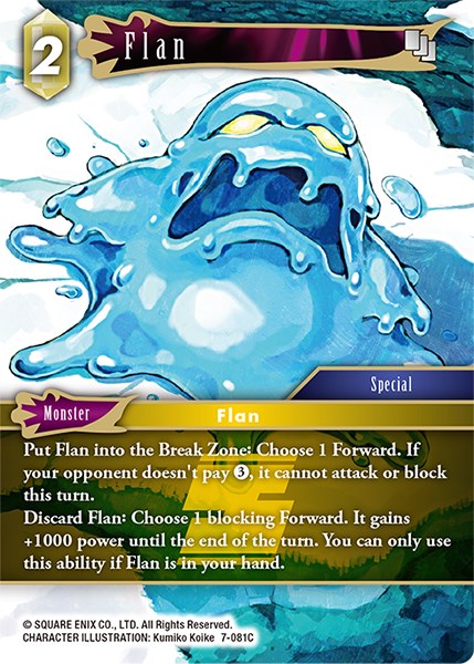 Discard Flan: Choose 1 blocking Forward. It gains +1000 power until the end of the turn. You can only use this ability if Flan is in your hand.