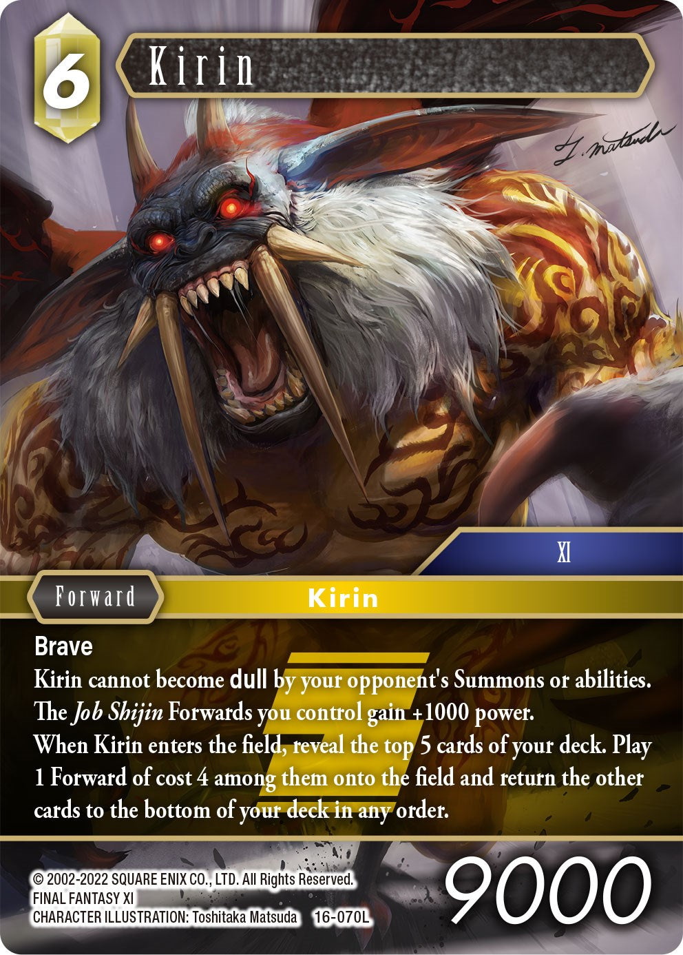 When Kirin enters the field, reveal the top 5 cards of your deck. Play 1 Forward of cost 4 among them onto the field and return the other cards to the bottom of your deck in any order.