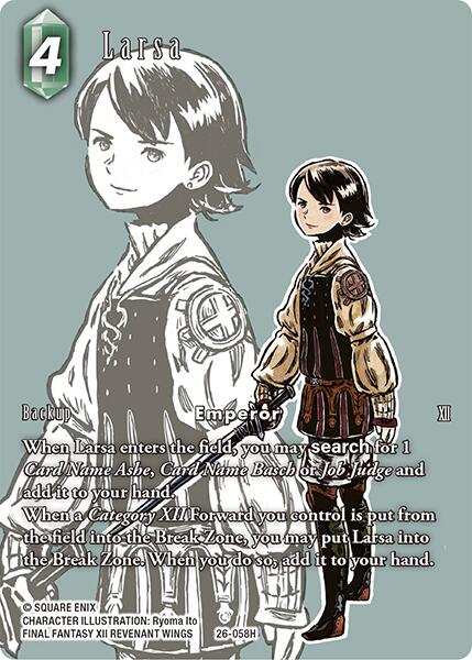 When Larsa enters the field, you may search for 1 Card Name Ashe, Card Name Basch or Job Judge and add it to your hand.