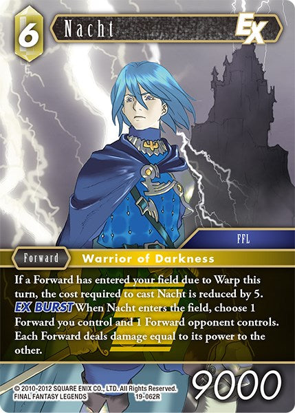 If a Forward has entered your field due to Warp this turn, the cost required to cast Nacht is reduced by 5.