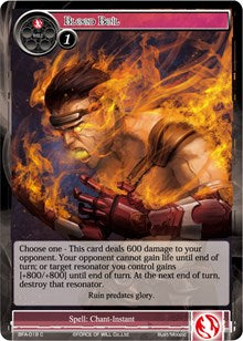 Choose one - This card deals 600 damage to your opponent. Your opponent cannot gain life until end of turn; or target resonator you control gains [+800/+800] until end of turn. At the next end of turn, destroy that resonator.