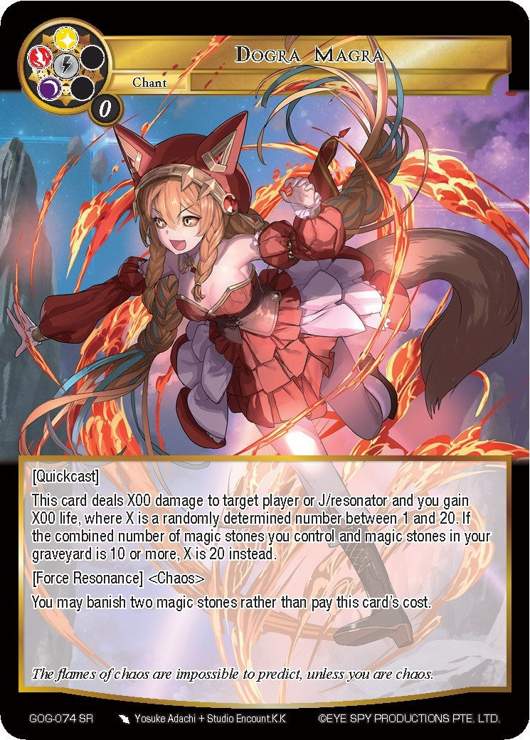 [Quickcast] This card deals X00 damage to target player or J/resonator and you gain X00 life, where X is a randomly determined number between 1 and 20. If the combined number of magic stones you control and magic stones in your graveyard is 10 or more, X is 20 instead. [Force Resonance] "Chaos" You may banish two magic stones rather than pay this card's cost.
