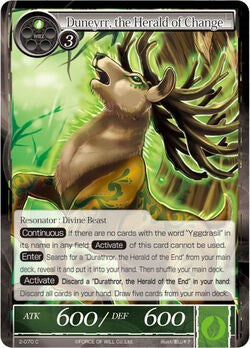 Resonator : Divine Beast [Continuous] If there are no cards with the word "Yggdrasil" in its name in any field, [Activate] of this card cannot be used. [Enter] Search for a card named "Durathror, the Herald of the End", from your main deck, reveal it and put it into your hand. Then shuffle your main deck. [Activate] Discard a card named "Durathror, the Herald of the End" from your hand : Discard all cards in your hand. Draw five cards from your main deck.