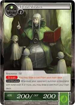 Resonator : Elf [Break] You may draw a card from your main deck. [Continuous] Whenever your opponent summons a resonator with total cost 4 or more, you may draw a card from your main deck.