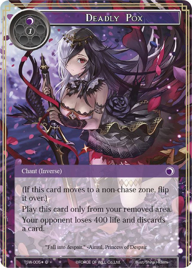 False Peace [Quickcast] You gain 400 life and draw a card. Then remove this card inverted from the game. (Remove this card from the game, flipped over.) Deadly Pox (If this card moves to a non-chase zone, flip it over.) Play this card only from your removed area. Your opponent loses 400 life and discards a card.