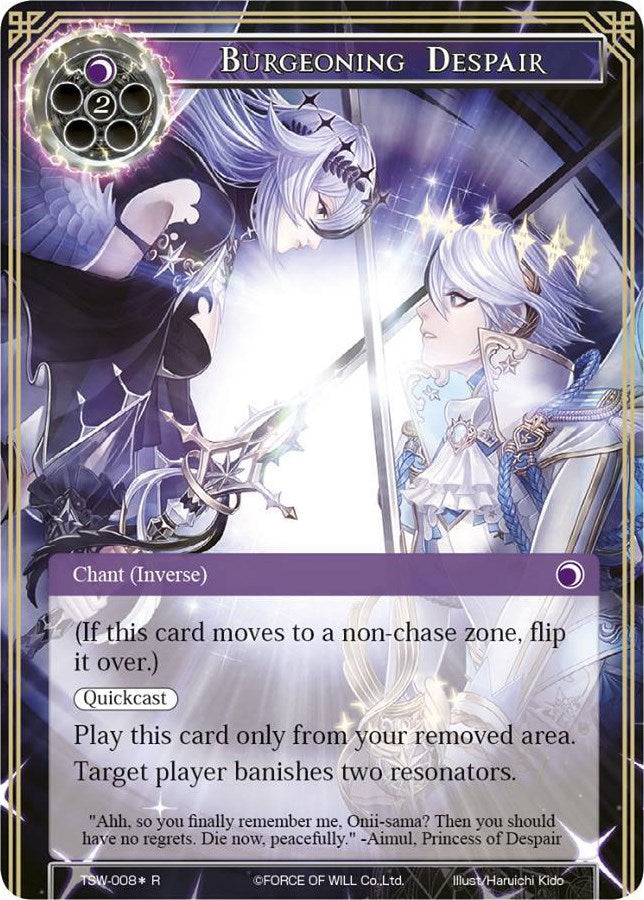 Flourishing Hope [Quickcast] Target J/resonator gains "This card cannot be destroyed." until end of turn. Then remove this card inverted from the game. Burgeoning Despair (If this card moves to a non-chase zone, flip it over.) [Quickcast] Play this card only from your removed area. Target player banishes two resonators.
