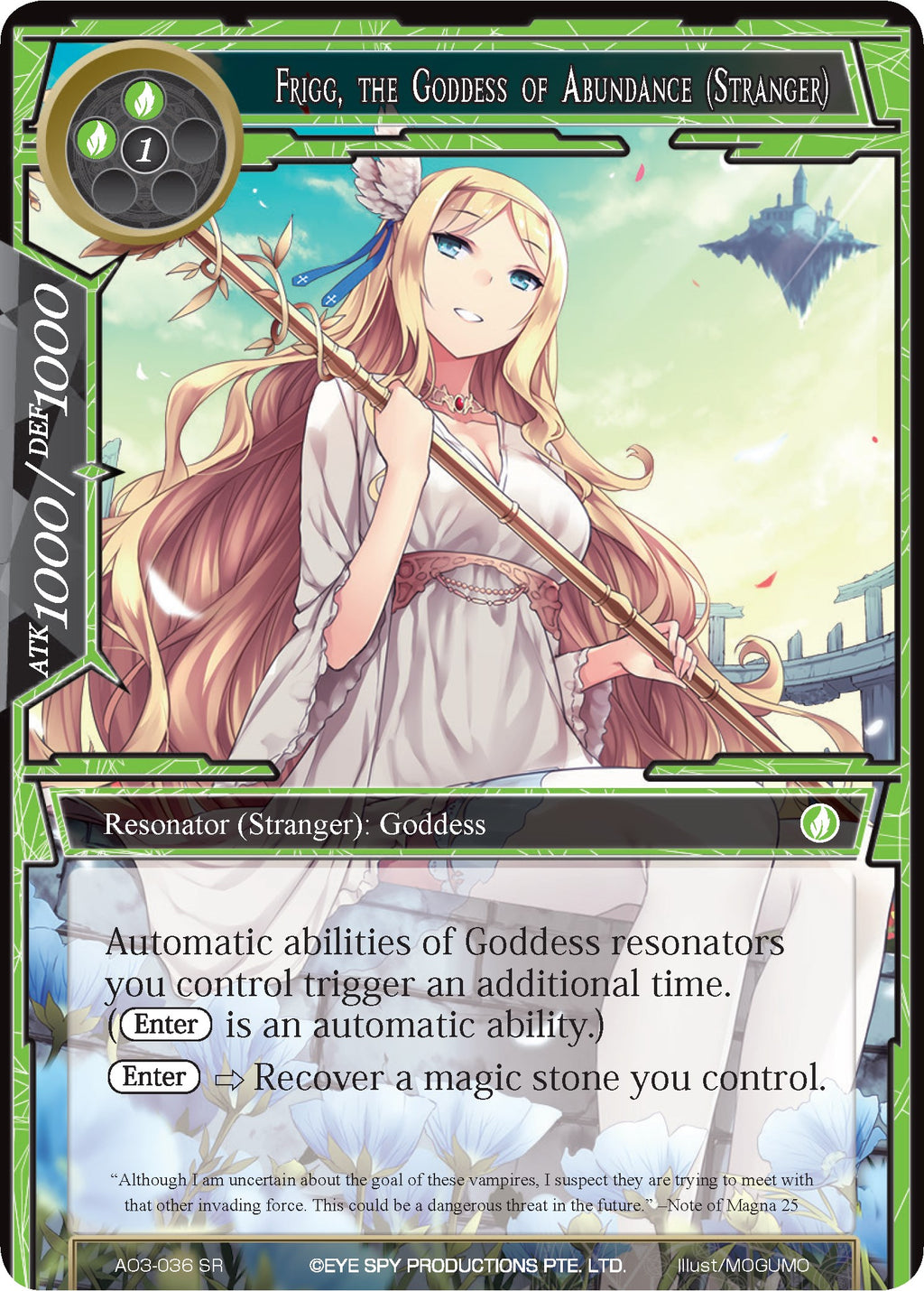 Automatic abilities of Goddess resonators you control trigger an additional time. ([Enter] is an automatic ability.) [Enter] -> Recover a magic stone you control.