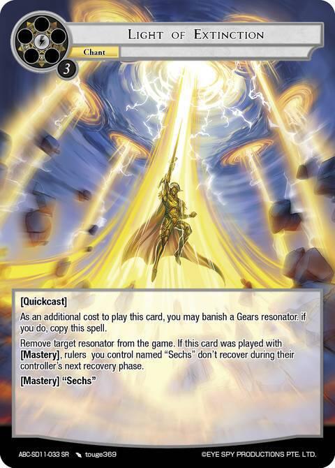 [Quickcast] As an additional cost to play this card, you may banish a Gears resonator. If you do, copy this spell. Remove target resonator from the game. If this card was played with [Mastery], a ruler named "Sechs" you control doesn't recover during its controller's next recovery phase. [Mastery] "Sechs"