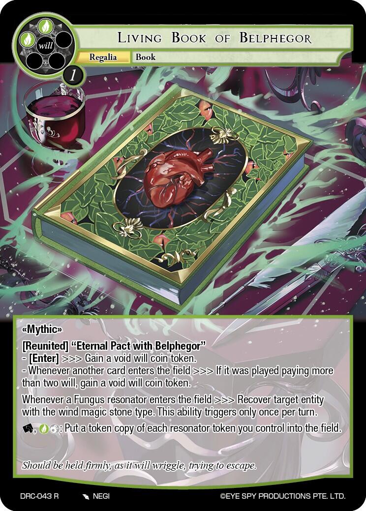 "Mythic" [Reunited] "Eternal Pact with Belphegor" - [Enter] Gain a void will coin token. - Whenever another card enters the field >>> If it was played paying more than two will, gain a void will coin token. Whenever a Fungus resonator enters the field >>> Recover target entity with the wind magic stone type. This ability triggers only once per turn. [Rest], GC: Put a token copy of each resonator token you control into the field.