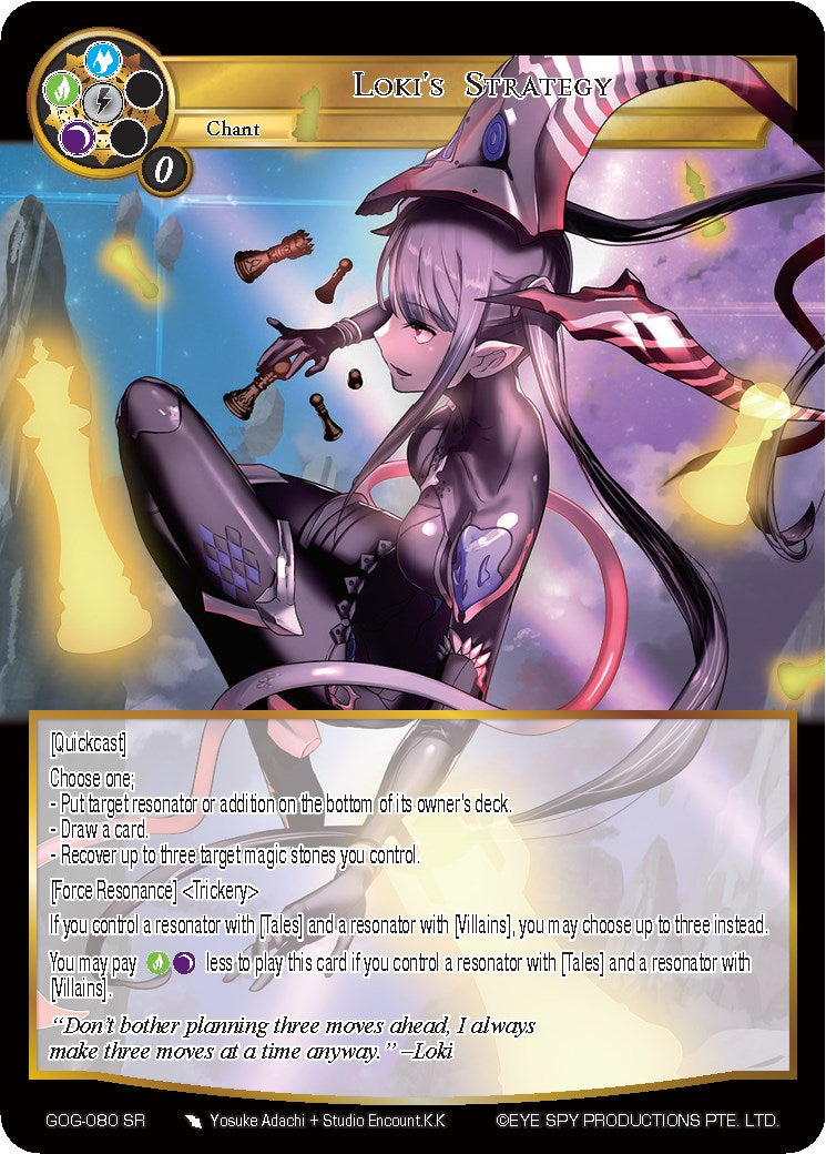 [Quickcast] Choose one; - Put target resonator or addition on the bottom of its owner's deck. - Draw a card. - Recover up to three target magic stones you control. [Force Resonance] "Trickery" If you control a resonator with [Tales] and a resonator with [Villains], you may choose up to three instead. You may pay GB less to play this card if you control a resonator with [Tales] and a resonator with [Villains].