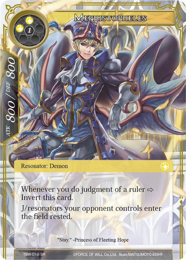 Mephistopheles Whenever you do judgment of a ruler -> Invert this card. J/resonators your opponent controls enter the field rested. Mephistopheles (Inverse) [Flying] J/resonators your opponent controls gain [-200/-200]. Resonators entering the field under your opponent's control don't cause their own abilities to trigger.