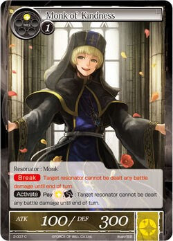 Resonator : Monk [Break] Target resonator cannot be dealt any battle damage until end of turn. [Activate] Pay W, [Rest] : Target resonator cannot be dealt any battle damage until end of turn.