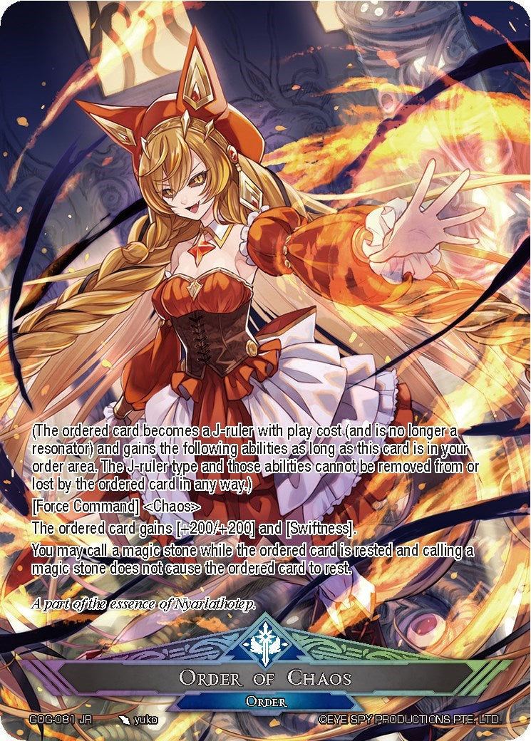 (The ordered card becomes a J-ruler with play cost (and is no longer a resonator) and gains the following abilities as long as this card is in your order area. The J-ruler type and those abilities cannot be removed from or lost by the ordered card in any way.)
