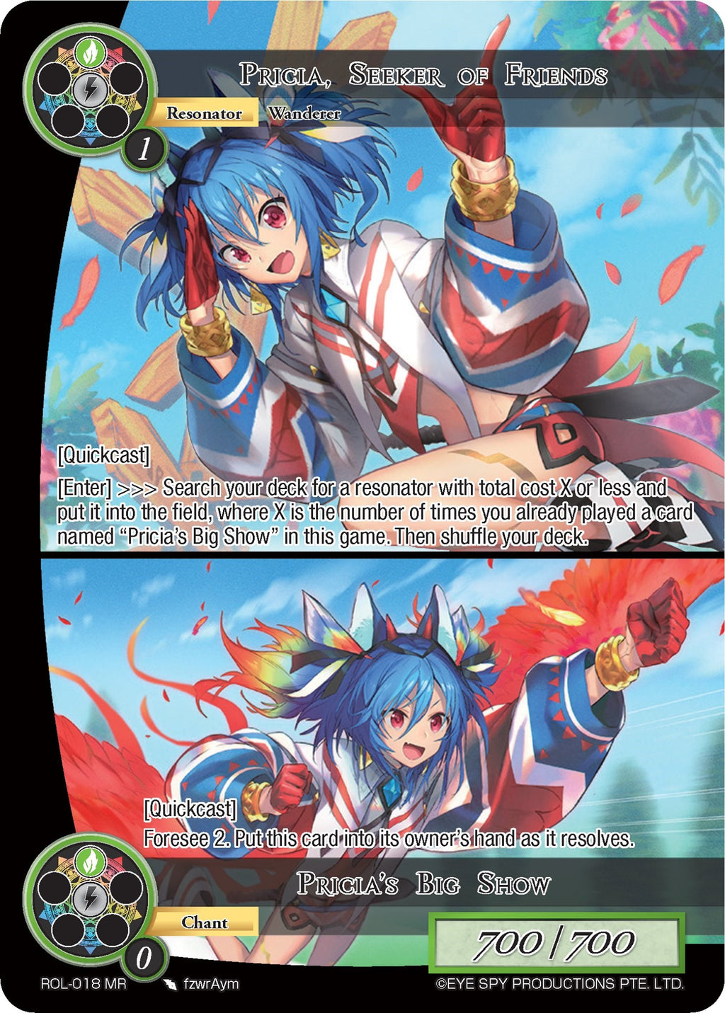 Pricia, Seeker of Friends Resonator Wanderer [Quickcast] [Enter] >>> Search your deck for a resonator with total cost X or less and put it into the field, where X is the number of times you already played a card named "Pricia's Big Show" in this game. Then shuffle your deck. Pricia's Big Show Spell Instant [Quickcast] Foresee 2. Put this card into its owner's hand as it resolves.