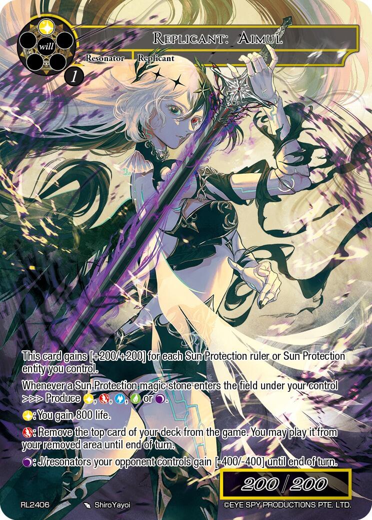 This card gains [+200/+200] for each Sun Protection ruler or entity you control. Whenever a Sun Protection magic stone enters the field under your control >>> Produce W, R, U, G or B. W: You gain 800 life. R: Remove the top card of your deck from the game. You may play it from your removed area until end of turn. B: J/resonators your opponent controls gain [-400/-400] until end of turn.