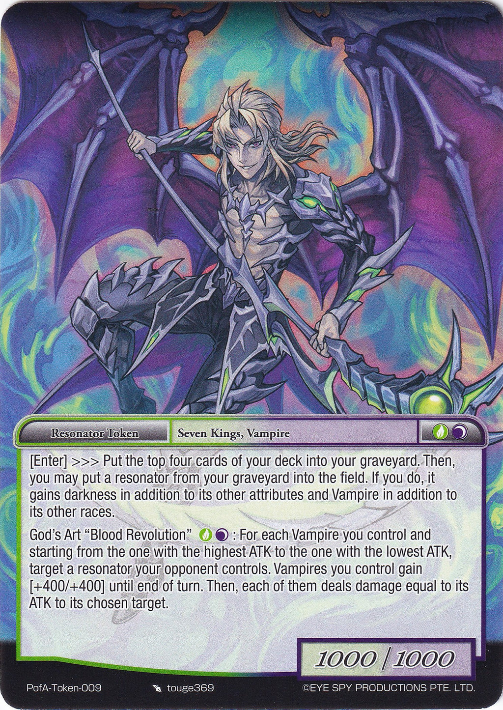[Enter] >>> Put the top four cards of your deck into your graveyard. Then, you may put a resonator from your graveyard into the field. If you do, it gains darkness in addition to its other attributes and Vampire in addition to its other races. God's Art "Blood Revolution" GB: For each Vampire you control and starting from the one with the highest ATK to the one with the lowest ATK, target a resonator your opponent controls. Vampires you control gain [+400/+400] until end of turn. Then, each of them deals damage equal to its ATK to its chosen target.
