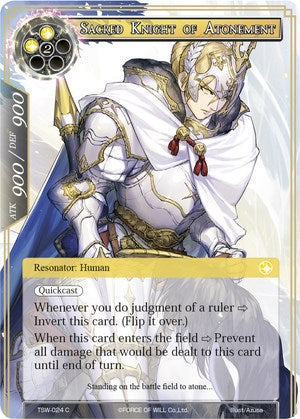 Sacred Knight of Atonement [Quickcast] Whenever you do judgment of a ruler -> Invert this card. (Flip it over.) When this card enters the field -> Prevent all damage that would be dealt to this card until end of turn. Dark Knight of Conviction [Precision] Whenever this card attacks -> Target J/resonator gains [-200/-200] until end of turn.