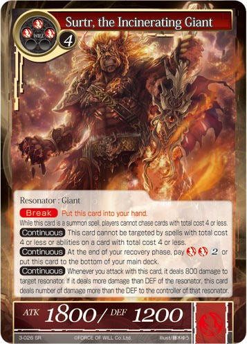 [Break] Put this card into your hand. While this card is a summon spell, players cannot chase cards with total cost 4 or less. [Continuous] This card cannot be targeted by spells with total cost 4 or less or abilities on a card with total cost 4 or less. [Continuous] At the end of your recovery phase, pay RR2 or put this card on the bottom of your main deck. [Continuous] Whenever you attack with this card, it deals 800 damage to target resonator. If it deals more damage than DEF of the resonator, this card deals number of damage more than the DEF to the controller of that resonator.
