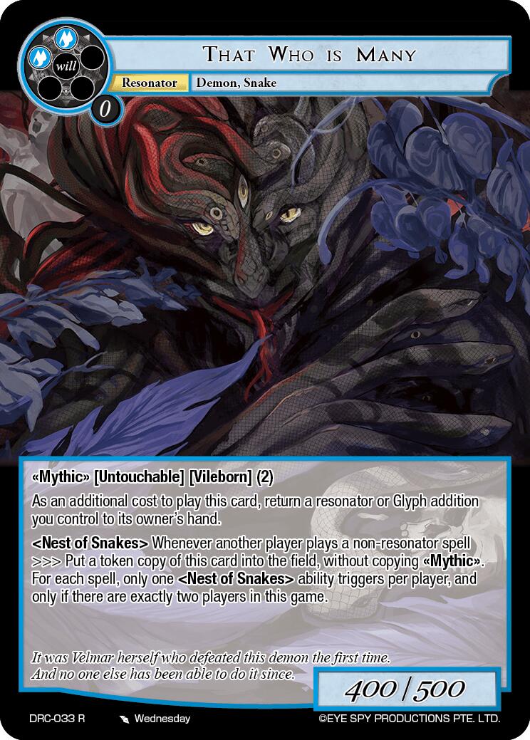 "Mythic" [Untouchable] [Vileborn] (2) As an additional cost to play this card, return a resonator or Glyph addition you control to its owner's hand. "Nest of Snakes" Whenever another player plays a non-resonator spell >>> Put a token copy of this card into the field, without copying "Mythic". For each spell, only one "Nest of Snakes" ability triggers per player, and only if there are exactly two players in this game.