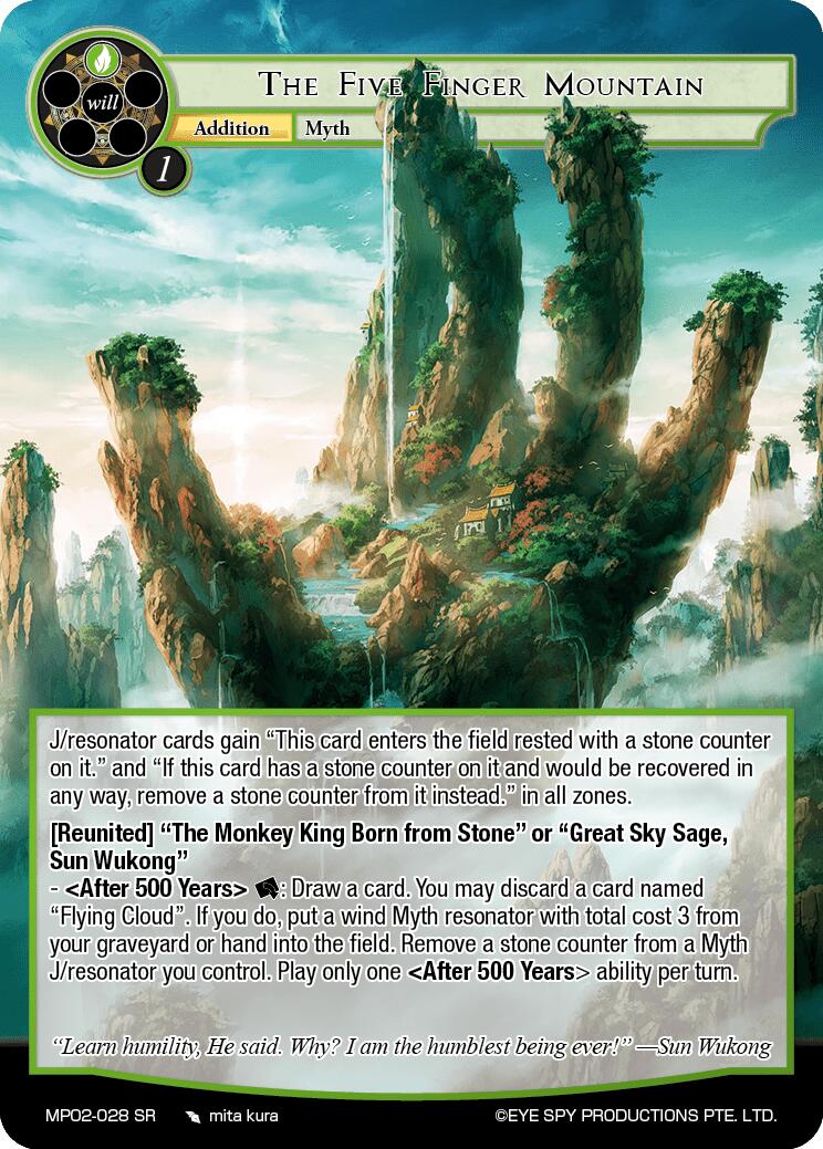 J/resonator cards gain "This card enters the field rested with a stone counter on it." and "If this card has a stone counter on it and would be recovered in any way, remove a stone counter from it instead." in all zones. [Reunited] "The Monkey King Born from Stone" or "Great Sky Sage, Sun Wukong" -"After 500 Years" [Rest]: Draw a card. You may discard a card named "Flying Cloud". If you do, put a wind Myth resonator with total cost 3 from your graveyard or hand into the field. Remove a stone counter from a Myth J/resonator you control. Play only one"After 500 Years" ability per turn.