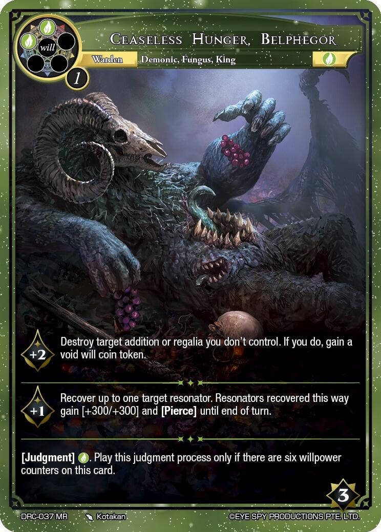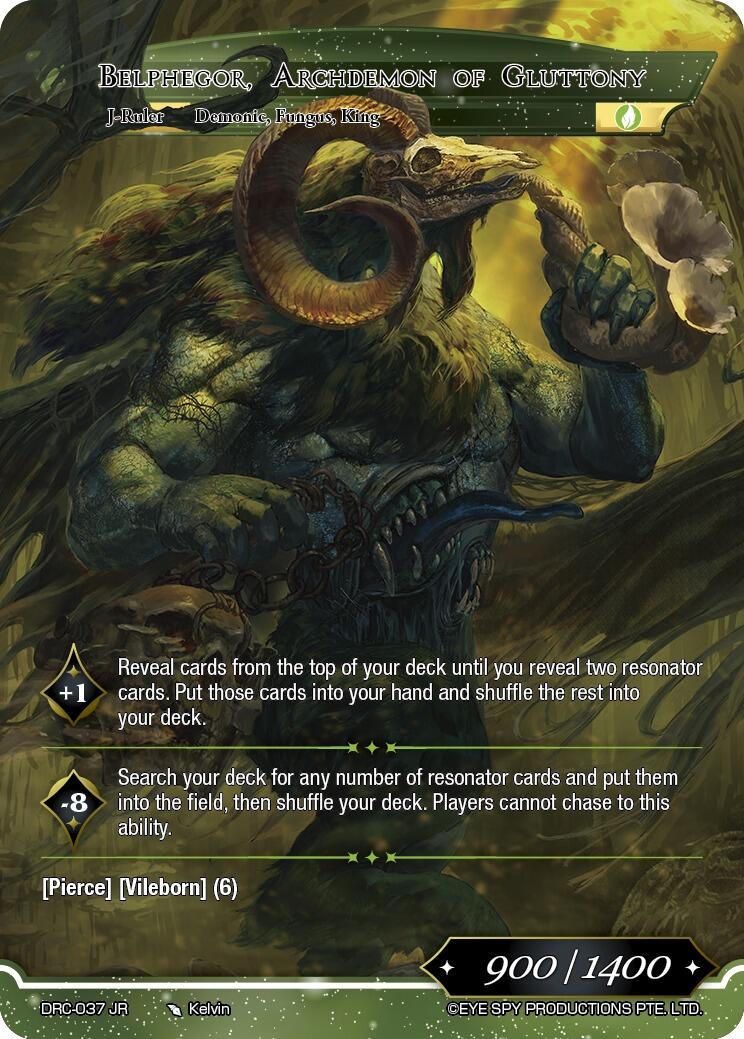 [+2] Destroy target addition or regalia you don't control. If you do, gain a void will coin token. [+1] Recover up to one target resonator. Resonators recovered this way gain [+300/+300] and [Pierce] until end of turn. [Judgment] G. Play this judgment process only if there are six willpower counters on this card. Belphegor, Archdemon of Gluttony [+1] Reveal cards from the top of your deck until you reveal two resonator cards. Put those cards into your hand and shuffle the rest into your deck. [-8] Search your deck for any number of resonator cards and put them into the field, then shuffle your deck. Players cannot chase to this ability. [Pierce] [Vileborn] (6)