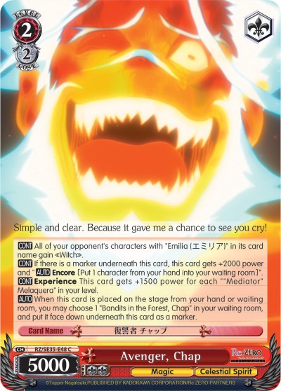 [CONT] All of your opponent's characters with "Emilia" in its card name gain "Witch". [CONT] If there is a marker underneath this card, this card gets +2000 power and "[AUTO] Encore [Put 1 character from your hand into your waiting room]". [CONT] Experience This card gets +1500 power for each ""Mediator" Melaquera" in your level. [AUTO] When this card is placed on the stage from your hand or waiting room, you may choose 1 "Bandits in the Forest, Chap" in your waiting room, and put it face down underneath this card as a marker.