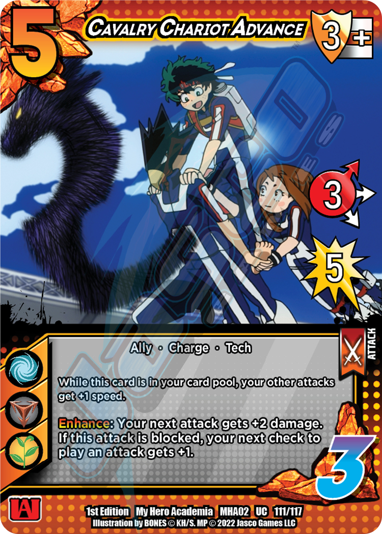 While this card is in your card pool, your other attacks get +1 speed. Enhance: Your next attack gets +2 damage. If this attack is blocked, your next check to play an attack gets +1.