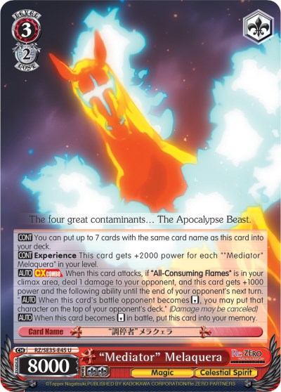 [CONT] You can put up to 7 cards with the same card name as this card into your deck. [CONT] Experience This card gets +2000 power for each ""Mediator" Melaquera" in your level. [AUTO] [CXCOMBO] When this card attacks, if"AllConsuming Flames" is in your climax area, deal 1 damage to your opponent, and this card gets +1000 power and the following ability until the end of your opponent's next turn. "[AUTO] When this card's battle opponent becomes [REVERSE], you may put that character on the top of your opponent's deck." (Damage may be canceled) [AUTO] When this card becomes [REVERSE] in battle, put this card into your Memory.