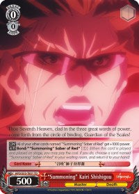 [CONT] All of your other characters named ""Summoning" Saber of Red" get +1000 power. [AUTO] Bond/""Summoning" Saber of Red" [(1)] (When this card is played and placed on the stage, you may pay the cost. If you do, choose a card named ""Summoning" Saber of Red" in your waiting room, and return it to your hand.)